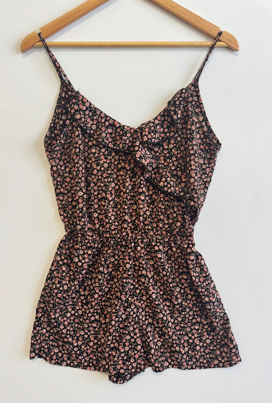Charming floral romper from TOBI, featuring a delightful pink floral print set against a sleek black... Show more