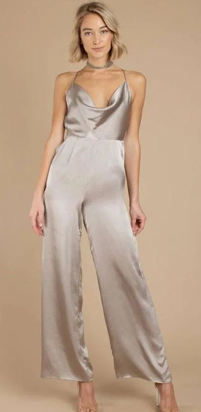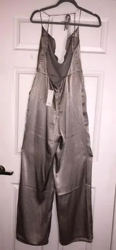 Silky satin Silvery/taupe colored jumpsuit with a scoop neck and open back. Never worn with the tag... Show more