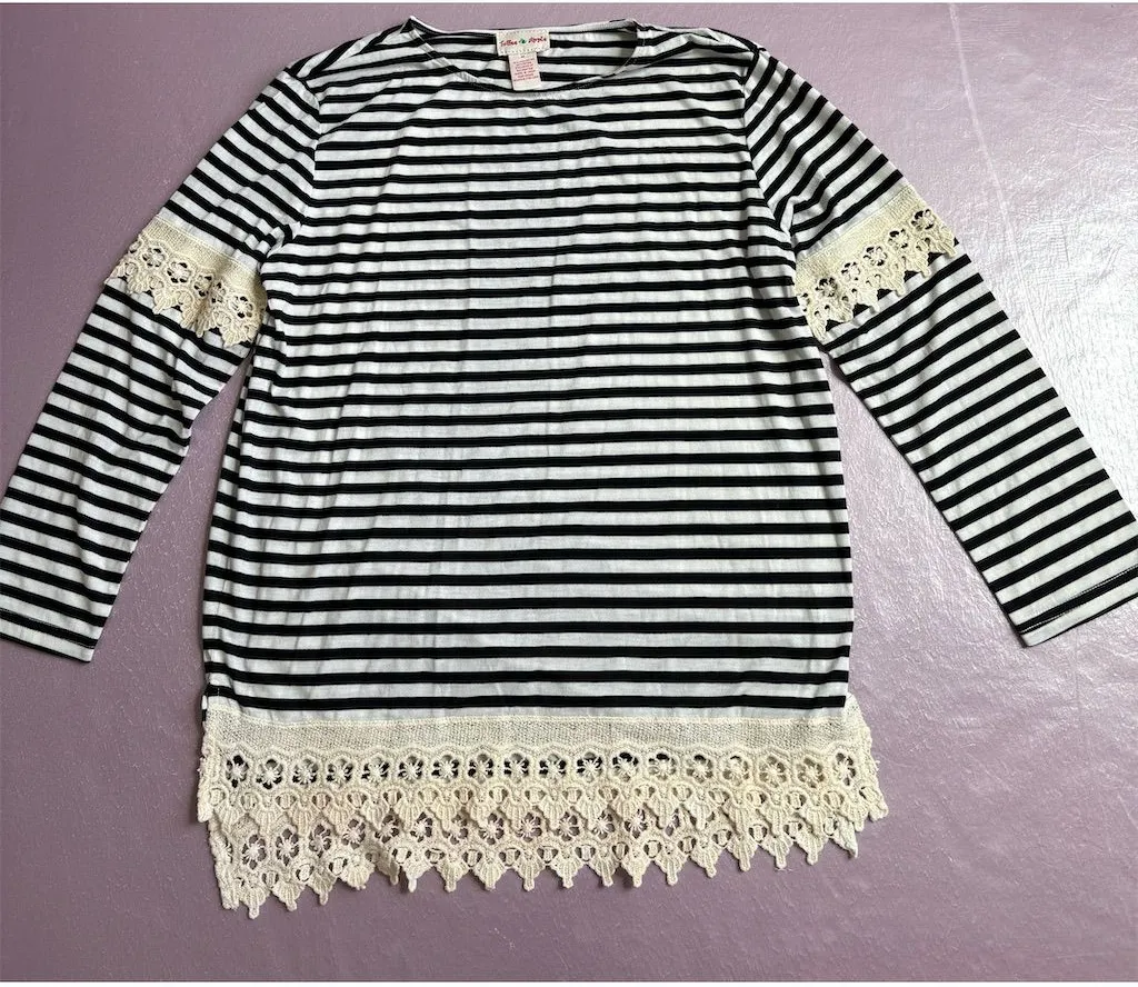 For a touch of elegance in your everyday wardrobe, the Toffee Apple Women's Long Sleeve Blouse in classic black is your go-to choice. This basic yet chic piece features a stylish striped pattern and delicate lace accents, perfect for casual spring outings. Crafted from a blend of polyester and rayon, it offers a comfortable stretch fit that moves with you. The lace trim adds a hint of sophistication, making it versatile for any casual occasion. Machine washable for easy care, this blouse is pre-owned and ready to bring a fresh look to your collection. Brand: Toffee Apple Size: M Color: Black