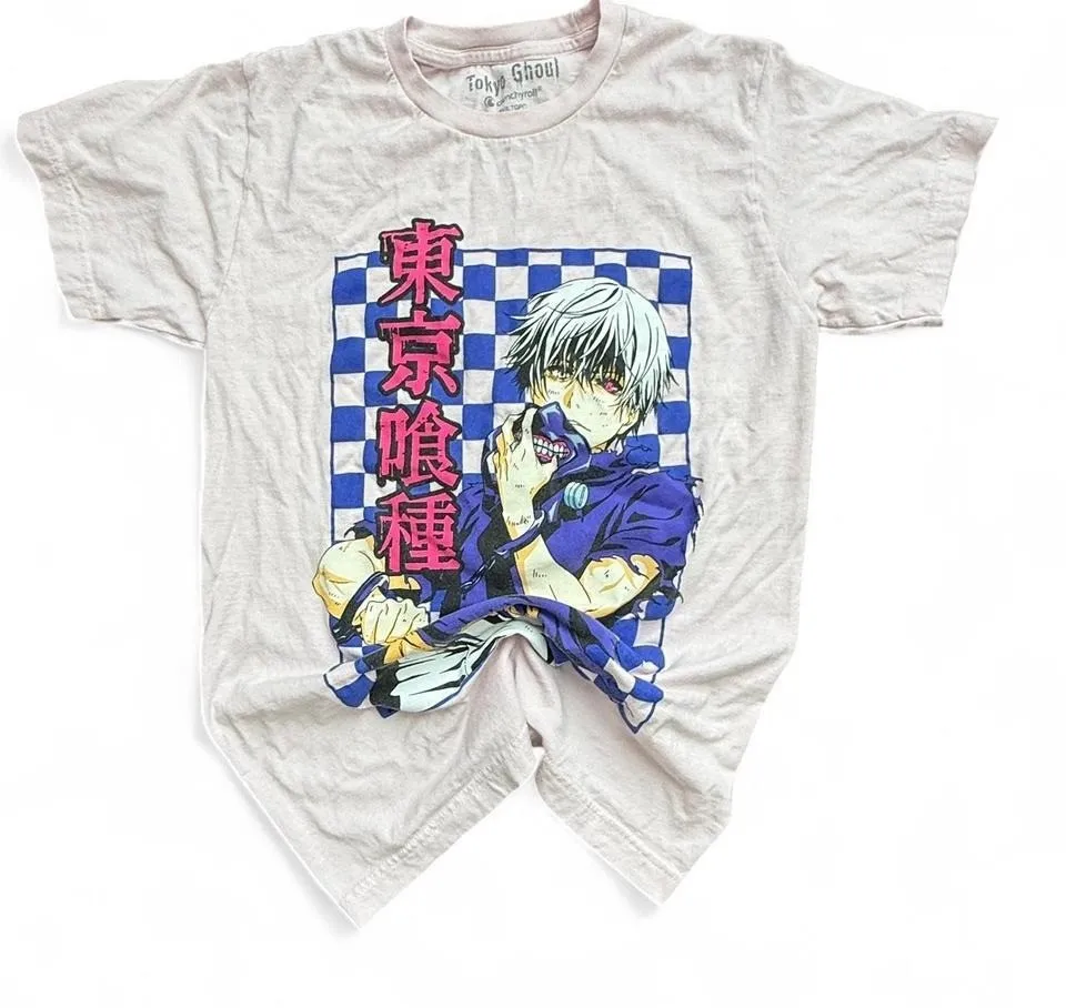Tokyo Ghoul anime T-shirt featuring a bold blue checkered and purple design with Kaneki Ken graphic and Japanese lettering. Made by Fifth Sun, 100% cotton, lightweight feel with a slightly cropped, boxy vintage fit. Condition: Pre-owned, worn with normal wash wear and overall fade. Anime, Graphic Tee, Tokyo Ghoul, Streetwear, Y2K Tokyo Ghoul Anime T-Shirt Unisex Small White Blue Purple Graphic Fifth Sun Vintage Style anime t shirt tokyo ghoul kaneki ken streetwear unisex small graphic tee vintage style fifth sun checkered blue purple cotton casual japan manga animewear fits & findz
