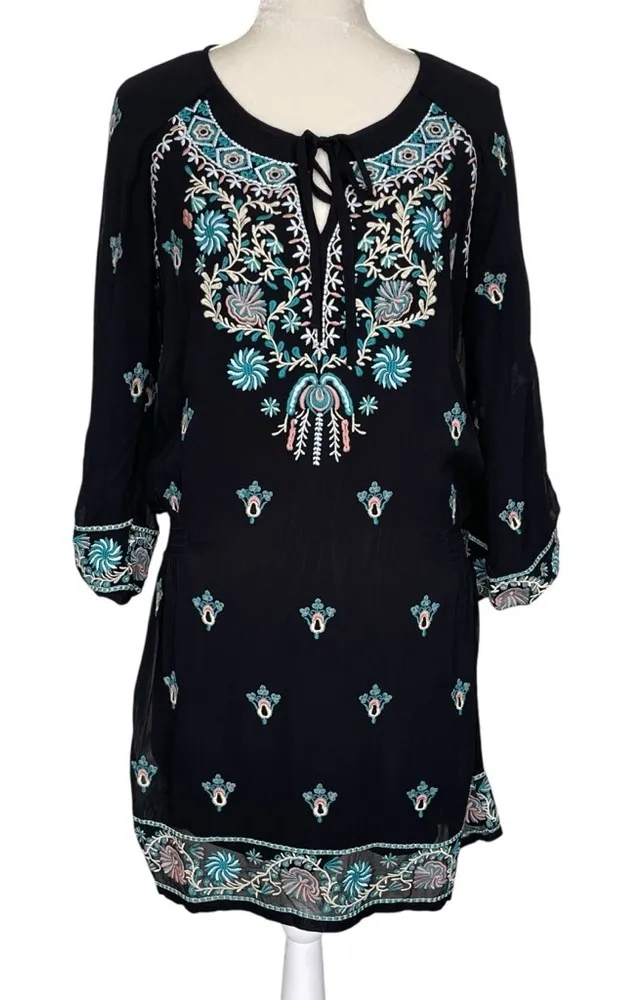 Black tunic chiffon dress with teal embroidered details all over Lined Elastic gathered at back waist Long sleeves Tie front at neck New with tags Size M Approximate measurements Chest 21.5” Waist 16” Length 37” -K22 -1