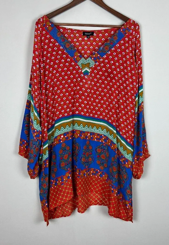 India Very good condition! It doesn't stand out, but there is a thin run in the fabric as pointed out - it runs all across the front. Measurements are in the photos. Pullover Lightweight, semi-sheer fabric V-neck Multicolor - reddish orange shade Fabric content and washing / care information in photos - see tag photos. All preowned items have been cleaned. Stored in a smoke and pet free home. Thanks for looking!