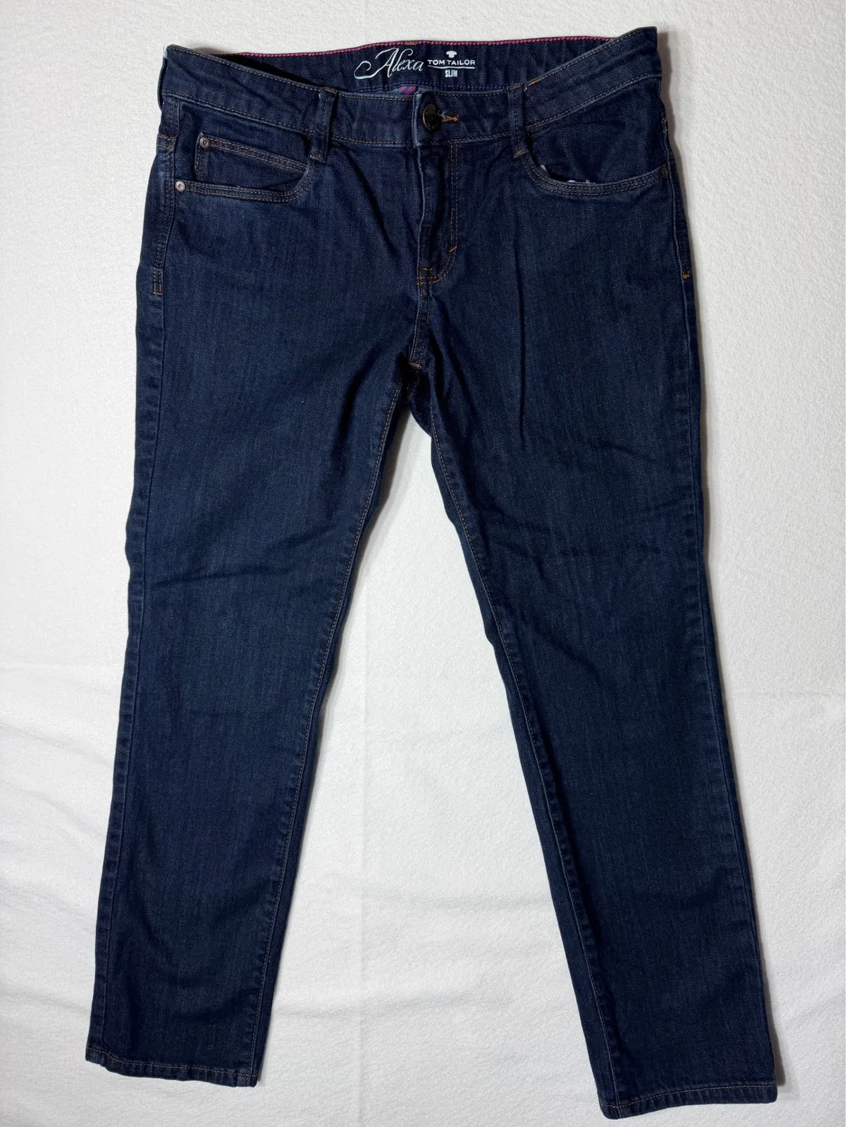 Discover your new favorite denim with these TOM TAILOR Alexa Slim Fit jeans. Crafted from a rich dark wash denim, these jeans offer a flattering slim fit that contours your silhouette for a sleek and modern look. The classic five-pocket styling and durable construction ensure both functionality and timeless appeal. Perfectly suited for a casual day out or a stylish evening, these jeans will become a versatile staple in your wardrobe. Measurements: • Waist: 17.5 in. • Inseam: 30 in. • Rise: 9 in. Style: Slim straight Department: Women Fabric Wash: Dark Waist Size: 32 in Type: Jeans Accents: Button, Logo Features: Stretch, Slimming, Comfort Fit: Slim Pattern: Solid Rise: Mid (8.5-10.5 in) Fabric Type: Denim Inseam: 30 in Material: Cotton, Spandex Closure: Button, Zip Model: Slim Product Line: Gap 1969 Keywords: Tom Tailor, Alexa, Slim Fit, Dark Wash, Denim, Jeans, Women's, Casual, Everyday, Classic, Comfortable, Versatile