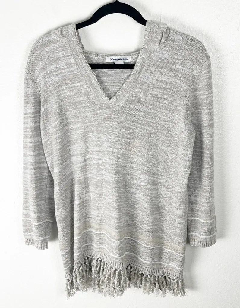 TOMMY BAHAMA Anacapa Silver Metallic Linen Blend Striped Fringe Trim V-Neck Hooded Sweater Size Smal... Show more