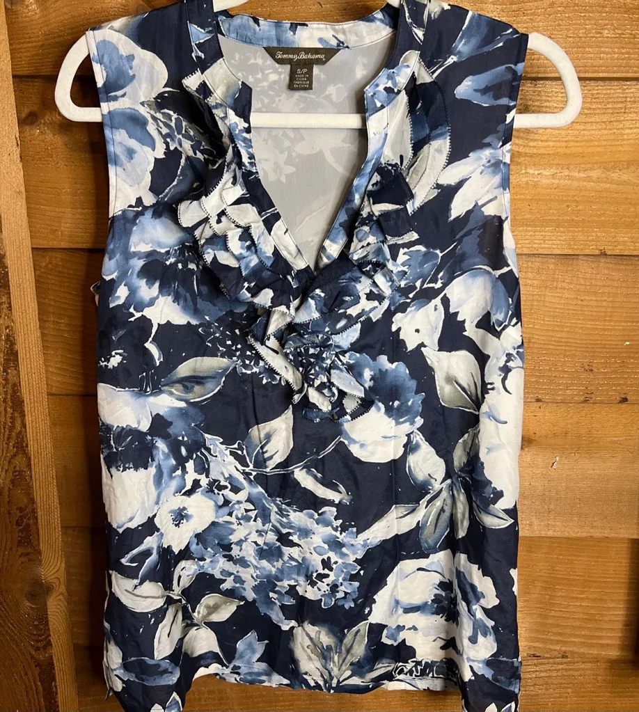 Silk blend. Lined. Flawless! Ruffle v neck silk lightweight Tommy Bahama Blouse Size small. P2P 1... Show more