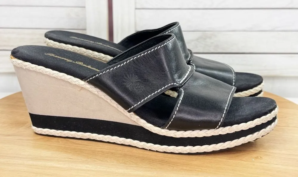 Tommy Bahama Kamala Wedge Heel Leather Slide Sandals Black White Size 9 Black leather upper Cutou... Show more