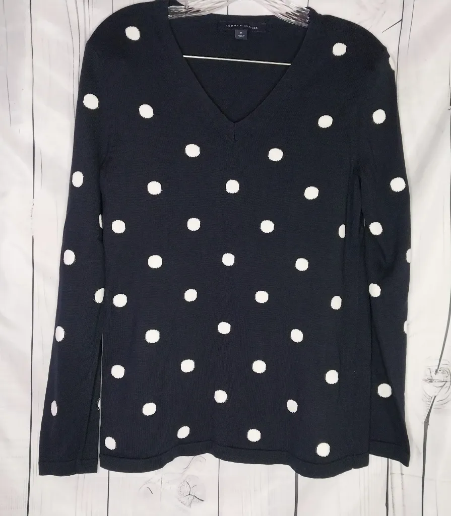 Tommy Hilfiger Dark Blue and White Polka Dot V-Neck Women's Sweater Size M pit to pit 17 length 24 1... Show more