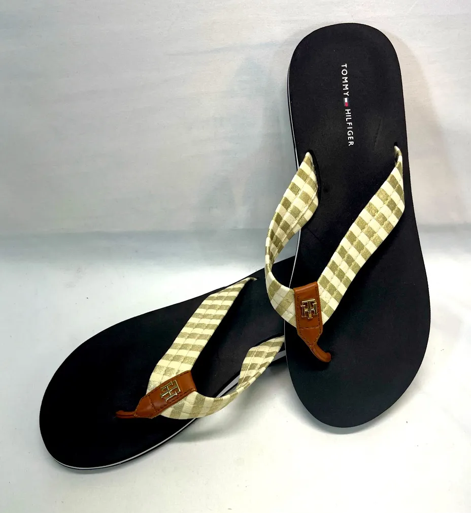 Elegant sandals with a black sole. Cream/Gold checkered straps add a stylish touch. Perfect for casu... Show more