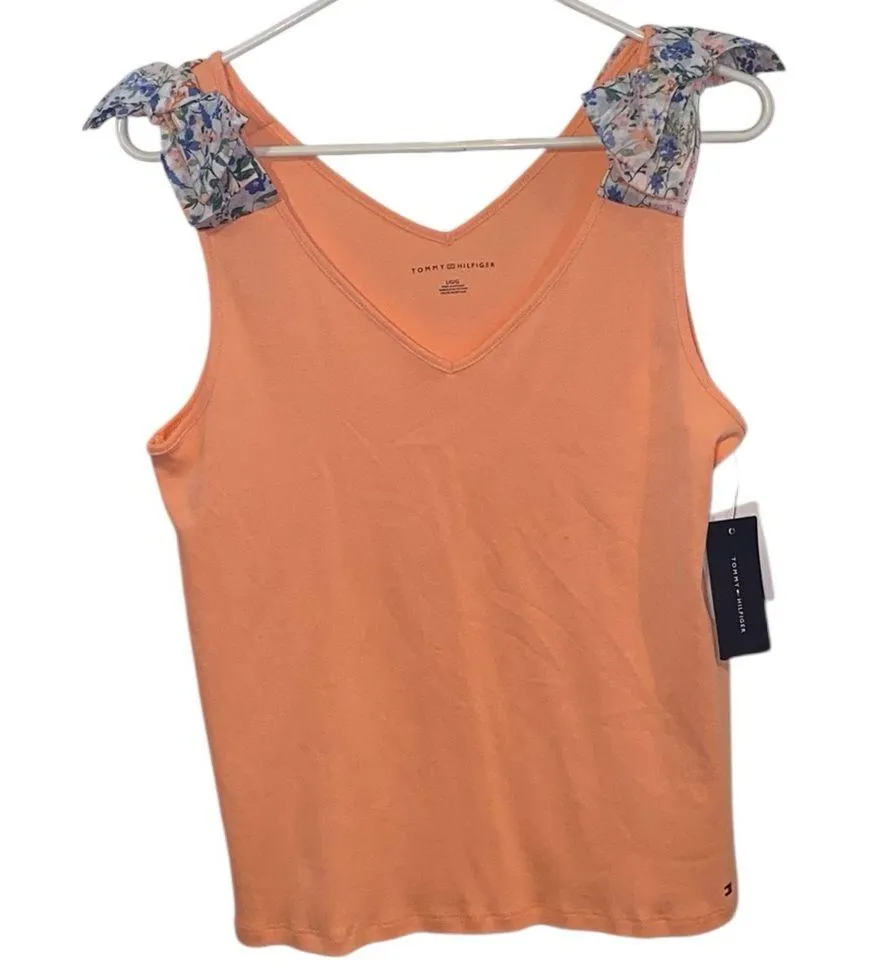 Brighten your wardrobe with this stylish orange sleeveless top. Featuring charming floral straps, it... Show more