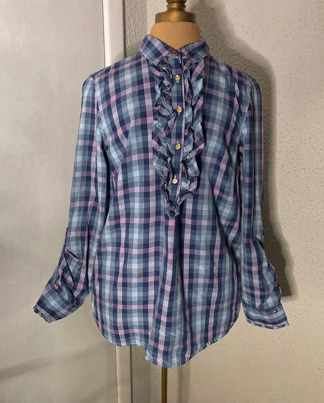 Style: Plaid blouse with placket long sleeve button down Color: Blue/Pink Size: M Armpit: 18” Length... Show more