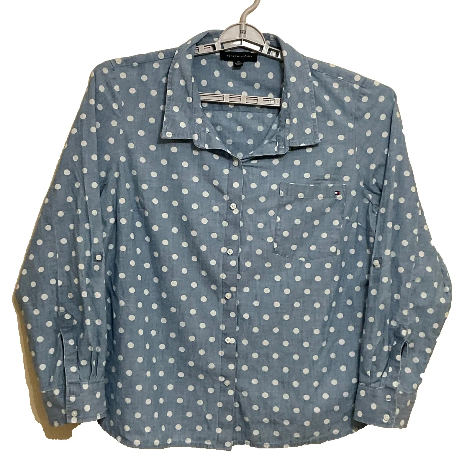 This Tommy Hilfiger roll tab sleeve cotton shirt in blue with white polka dots is a versatile and st... Show more