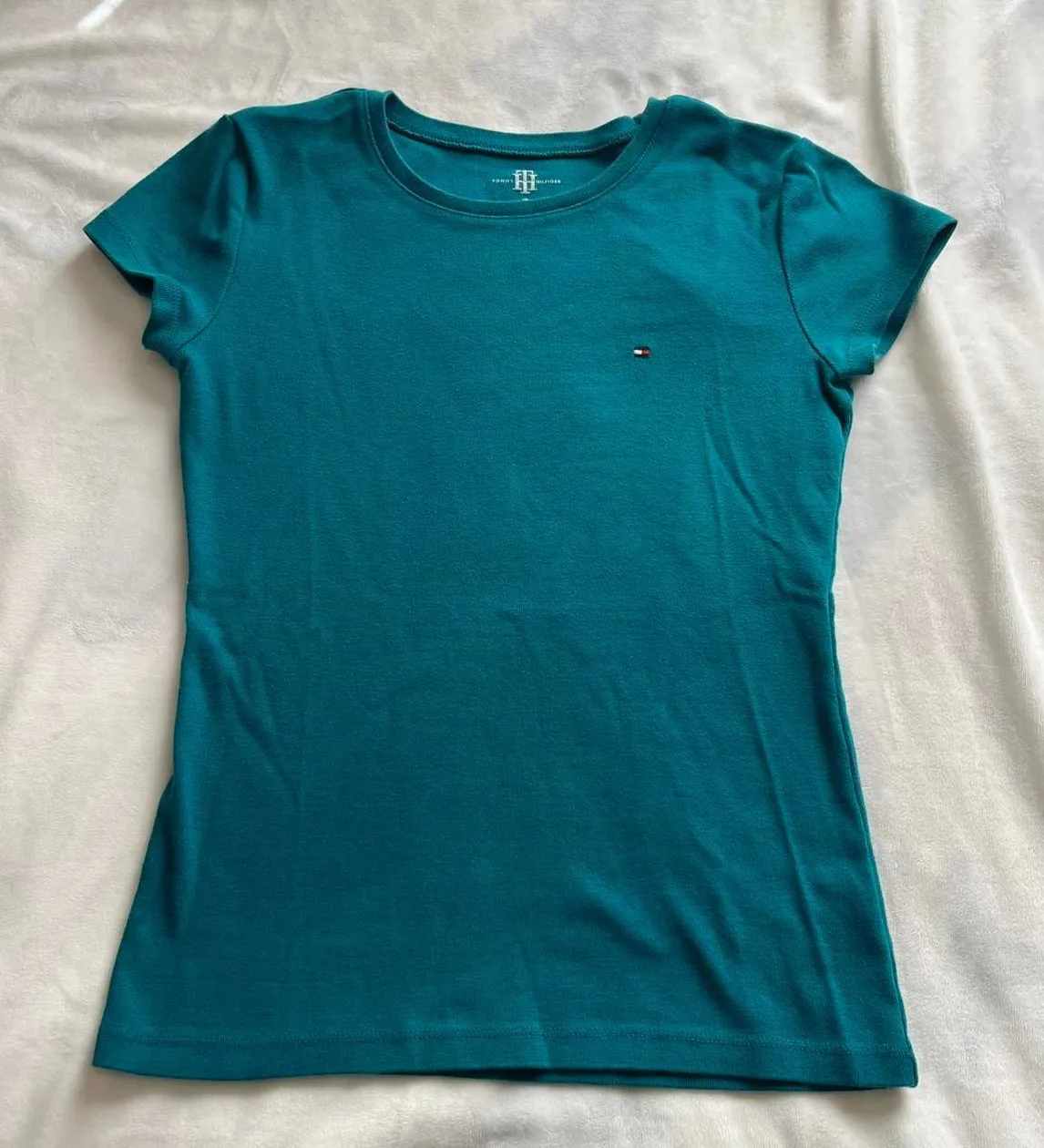 Tommy Hilfiger slim-fit logo teal tee 100% cotton super cute Tommy Hilfiger fitted tee in a teal c... Show more