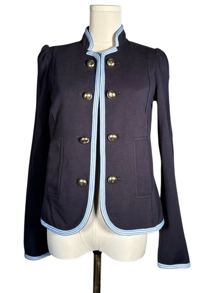 Stylish blue blazer with light blue trim. Features gold-tone buttons. Perfect for versatile wear. E... Show more