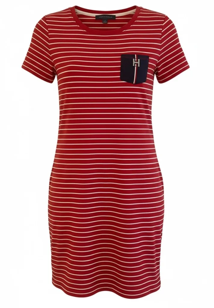 Stylish mini dress with red and white stripes. Features a navy pocket detail. Perfect for casual out... Show more