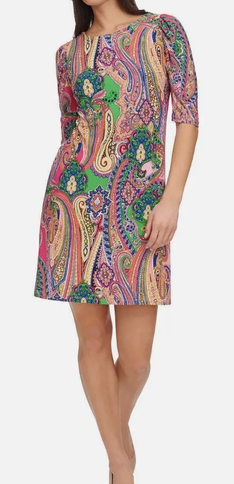 The Tommy Hilfiger Women's Size 12 Paisley Pink/Green Ruched Sleeve Shift Dress is a stylish and fem... Show more