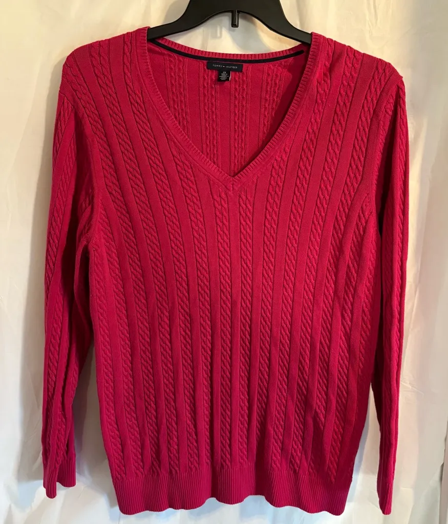 Tommy Hilfiger Womens Sweater Size 2X Cotton Pink Cable Knit V-Neck Preppy Prep Sweater is in excel... Show more
