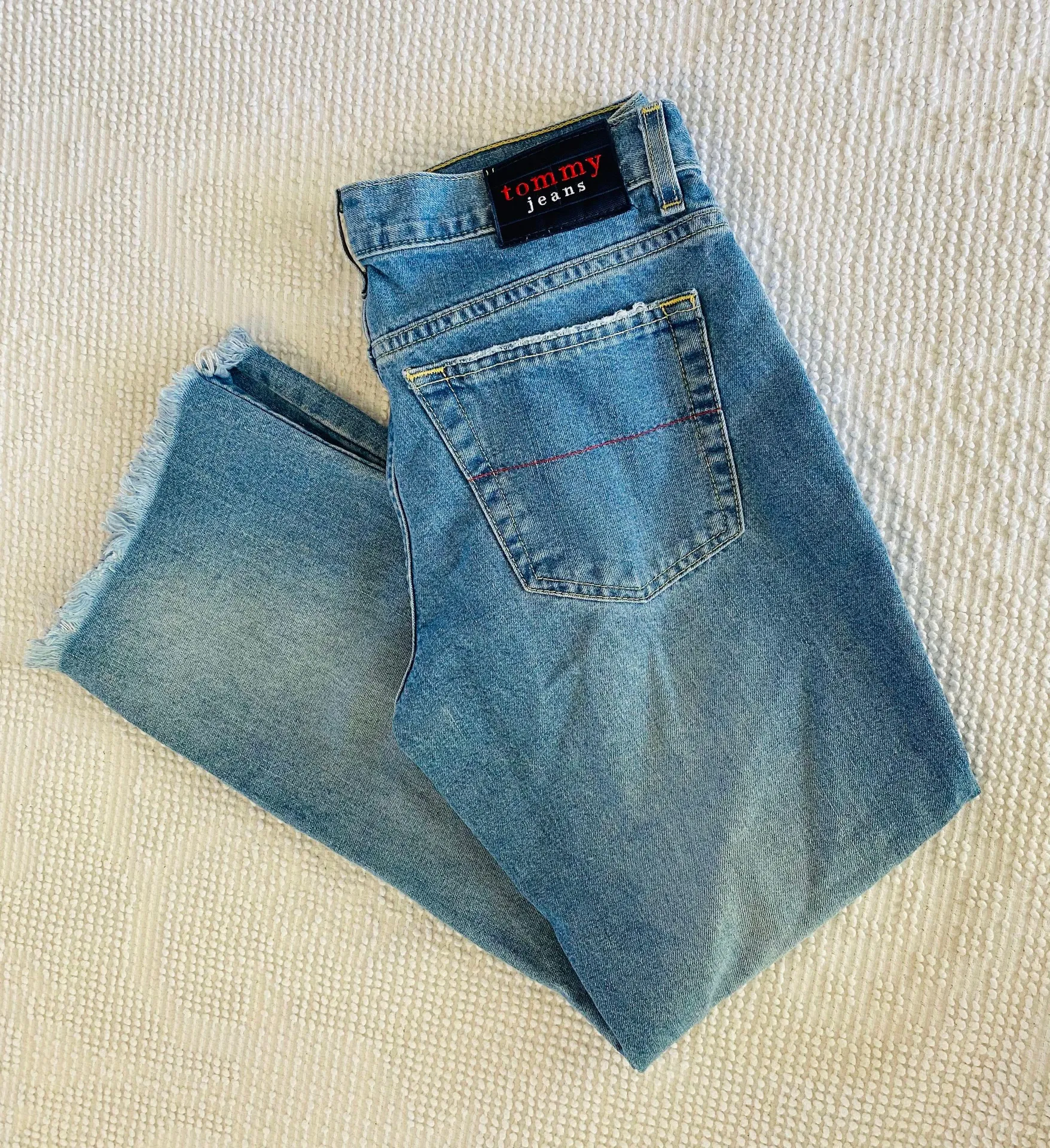 Super cute Y2K vintage Tommy jeans Light wash denim Raw hem Tommy branding Tag size 7 Fits l... Show more