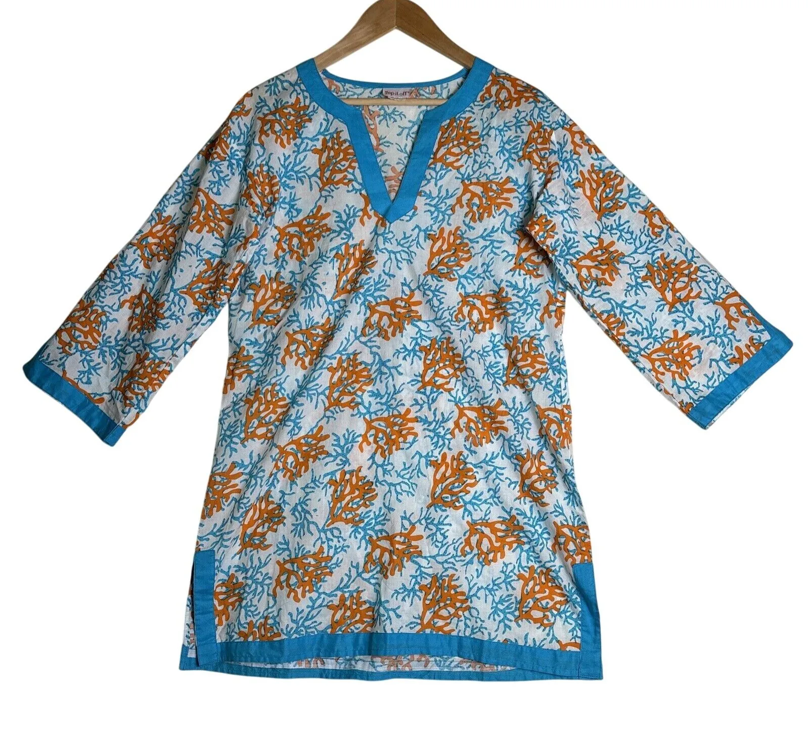 This Top It Off women's tunic in size small is a stylish addition to any wardrobe. The coral reef design in blue and orange adds a pop of color to any outfit. The 3/4 sleeves and v-neckline make it perfect for any occasion. This tunic is great for women who want to add a touch of elegance to their outfit. It is made of high-quality materials and is perfect for women who want to make a statement. Perfect as a Shirt or Swimsuit Coverup.
