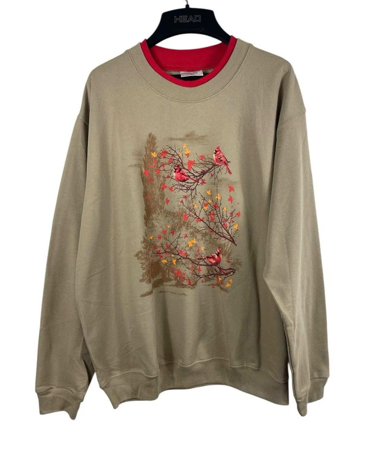 The Top Stitch by Morning Sun Sweatshirt is a vintage-inspired piece perfect for birdwatchers and fans of autumn. Featuring a solid pattern with a graphic print of cardinals and fall leaves, this pullover sweatshirt in beige and red color offers a cozy and comfortable fit in size XL. Made from a cotton blend material, this sweatshirt is ideal for activewear in the fall and winter seasons. With a crew neck and easy care features, it combines style and functionality for a unique and trendy look. **Has marks on the arms that are lighter and two red marks by shoulder, shown in pictures.** Otherwise color is nice and no fading.