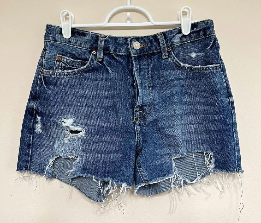 Topshop Size: 8 Great used condition Distressed denim shorts Button fly Ashley moto jean shorts... Show more