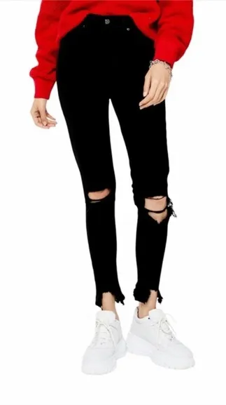 On sale is a pair of black Topshop Jamie High Rise Distressed Raw Hem Skinny Jeans in a size 25. The... Show more