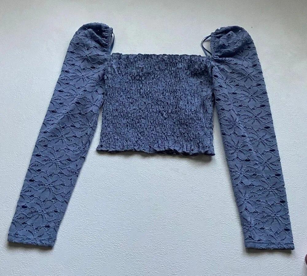 Romantic and stylish Topshop lace crop top in a dusty blue color. Features long puff sleeves, floral... Show more