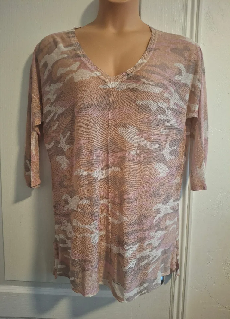 Chic long sleeve V-neck top with a pink camouflage design. Ideal for casual wear.