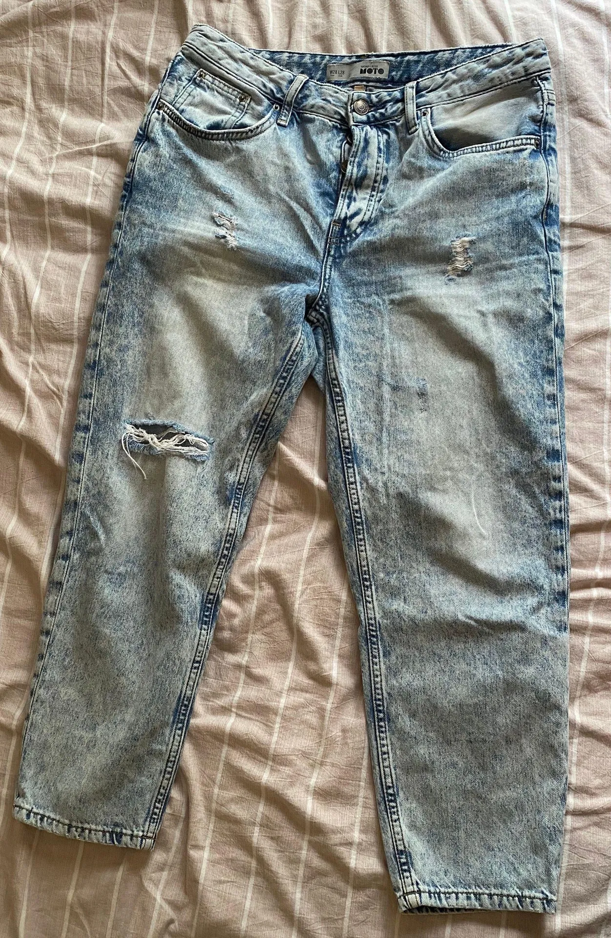 Petite. Nice and relaxed fit. Button fly. Distressed on front. Cropped. Acid light wash. W28 L28