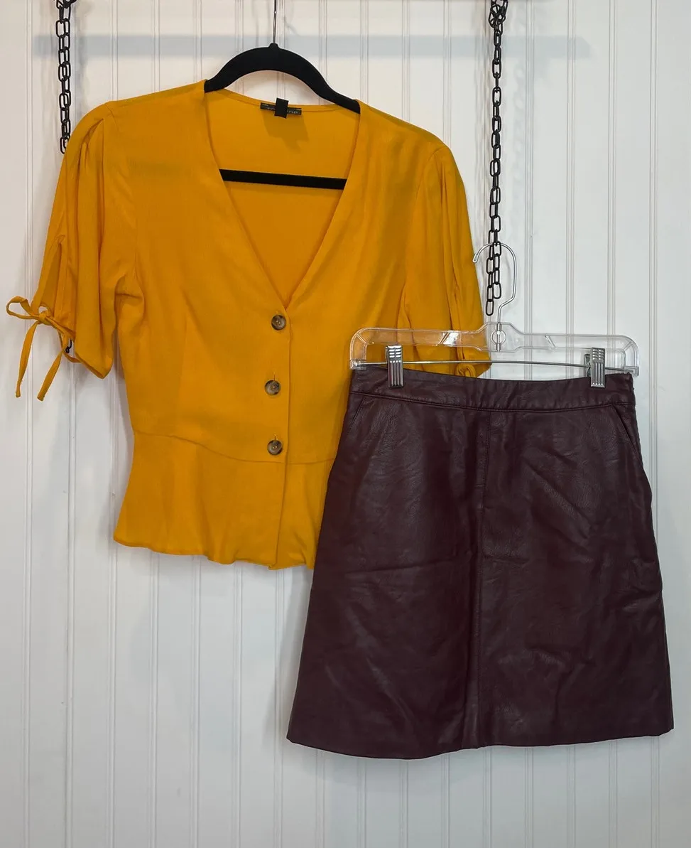 SET OF 2; 1 - Yellow Tie Sleeve, V-Neck, Button & Peplum Waist Blouse 1 - Leather Skirt Size 2 - Ex... Show more
