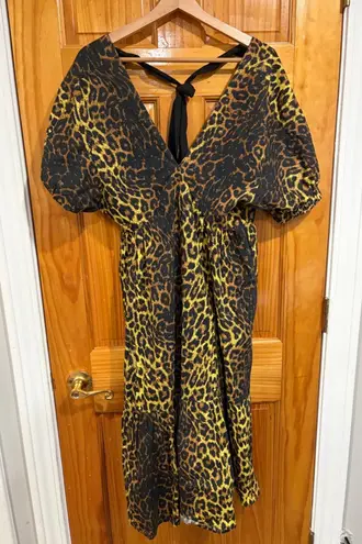 Bold and stunning Topshop leopard print midi dress featuring dramatic puff sleeves, a deep V necklin... Show more