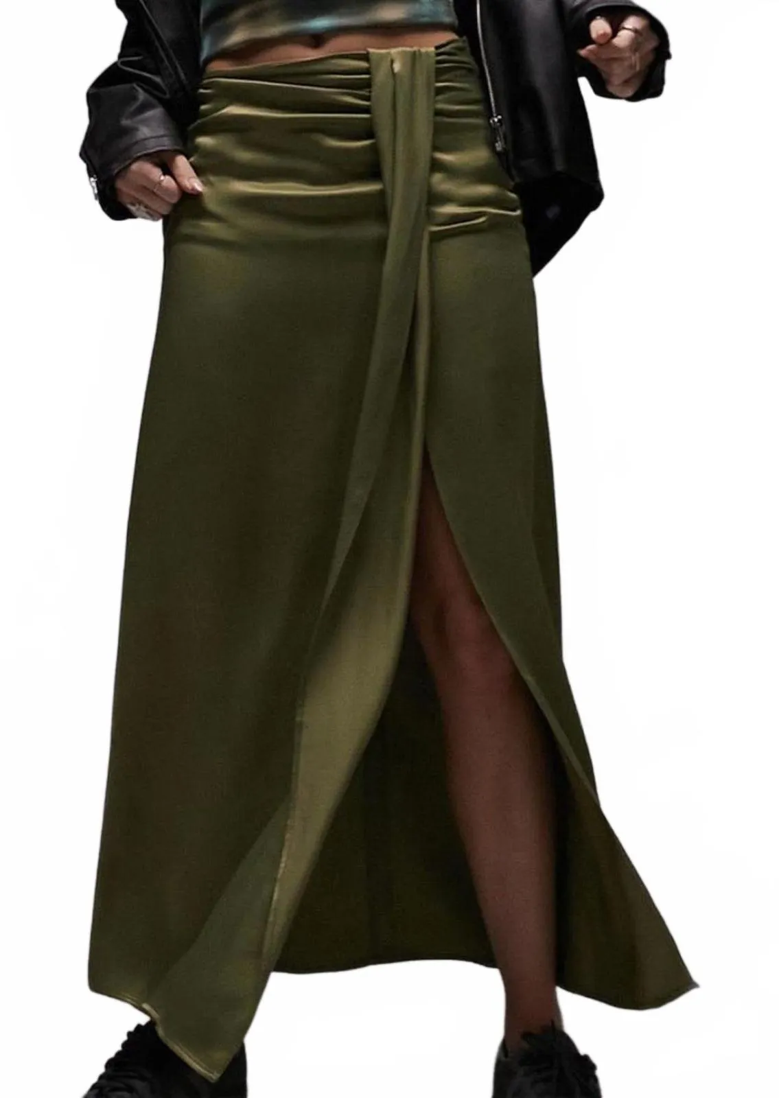 A faux-wrap detail tops this ruched satin skirt designed with a stem-showing side slit. 12.5" waist,... Show more
