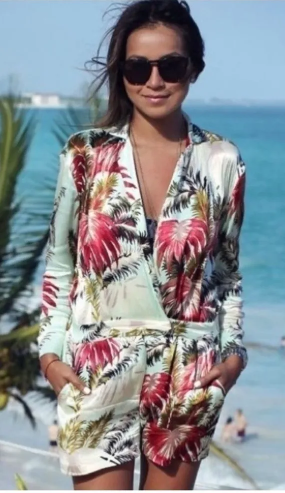 Topshop Green Pink Tropical Floral Satin V-Neck Long Sleeve Romper Size 10 Large Brand: Topshop Si... Show more