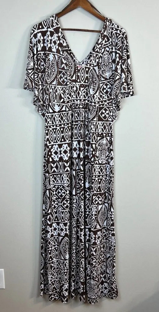 Tori Richards Honolulu Dress Medium Brown White Printed Maxi Flutter Sleeveless Womens Very good condition! No rips, tears, holes or stains. The brand tag is ripped and is marked. Pullover Sleeveless with flutter sleeve that wears like a short sleeve V-neck Geometric pattern Long, full length Lightweight and unlined (somewhat see through) Jersey stretch knit Polyester, spandex blend - hand wash underarm to underarm: 14.75 in waist (laying flat): 18.5 in length (shoulder to hem): 56.5 in