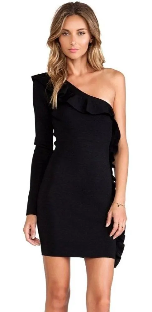 This Franca dress from Ronny Kobo is NWT. It is in a solid black color. It features; a one-shoulder neckline, long sleeves, ruffled details, sleek sheath silhouette and a mini length. It is crafted from a polyester blend. Condition: NWT Color: Black Material: Polyester Blend Size L Measurements: armpit to armpit 16 in, length 38 in, sleeve 20 in, Cocktail, Weekend, Party, Chic style, Romance, Date, Love, sexy, romantic, Party, Work wear, office, designer, casual, classic, date night, night out, holiday, chic, trendy, stylish, comfortable, lightweight, vacation, travel, minimalistic, Romantic, Feminine, Pretty, Valentine's Day, Valentine's, Christmas, holiday, wedding, reception, shower, graduation, Sheath, form-flattering, Off Shoulder neck, One Shoulder, Mini, Short, designer, luxury, classy, chic, L, Large, NEW, BNWT, knit, luxury, cocktail, ruffle, ruffled, sweater dress
