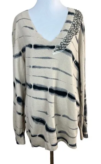 Very good condition overall! There were a couple of small holes at the hem that were mended as shown in photos. Features: Pullover Longline V-neck Beige and gray Beaded chain and lace accent Long sleeve Soft and cozy 100% cashmere - hand wash Underarm to underarm: 20.5 in Length (shoulder to hem): 29 in