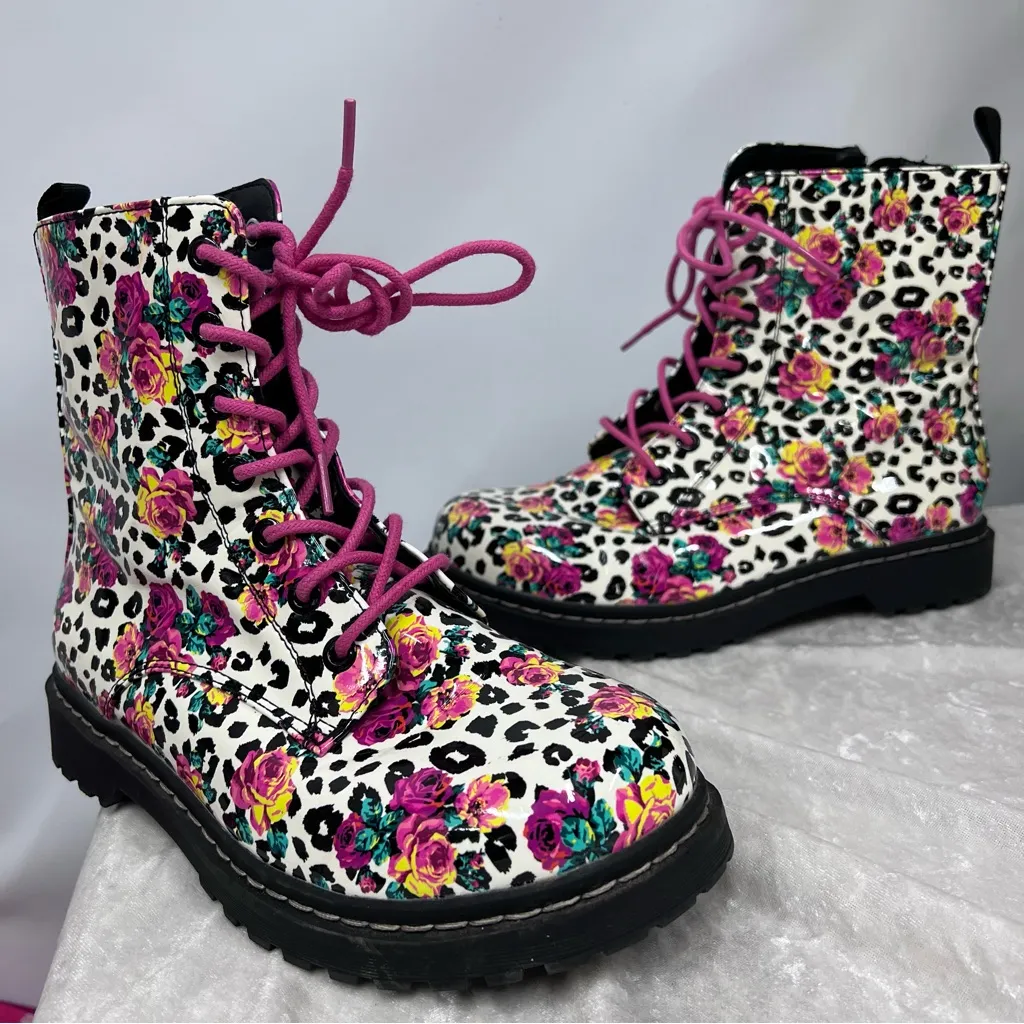 Wide width Light marks( see pics). Stylish combat boots with a vibrant floral and leopard print. F... Show more