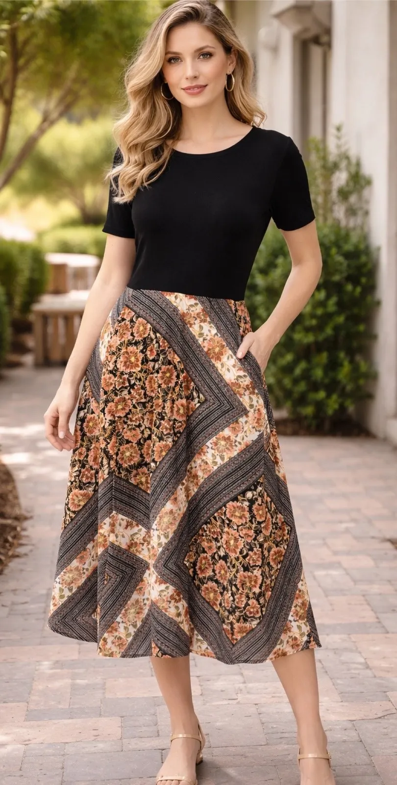 A women's black and floral patchwork print maxi dress. This stylish dress features a black short-sle... Show more