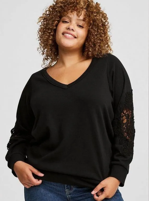 This sweater has a V neckline, is black, has long sleeves with a crochet detail, has a casual look,... Show more