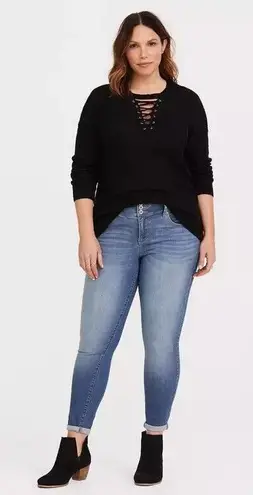 Elevate your wardrobe with this stylish Torrid black pullover sweater. Designed with a lattice lace-... Show more