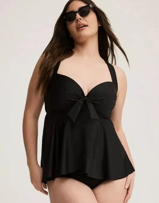 Chic black one-piece with a flattering fit. Features a stylish front tie detail. Ideal for beach or... Show more