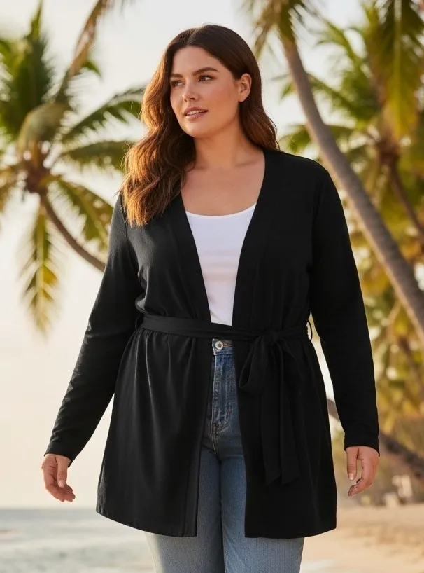 Wrap yourself in effortless style with this soft Torrid black tie-waist cardigan. This versatile piece drapes beautifully, creating a flattering silhouette that moves with you. The adjustable tie belt cinches your waist, offering customizable comfort and a polished finish. Perfect for layering over your favorite tops, this cardigan adds a touch of chic sophistication to any outfit. Ideal for a casual day out, a relaxed evening, or even a beachside stroll.
