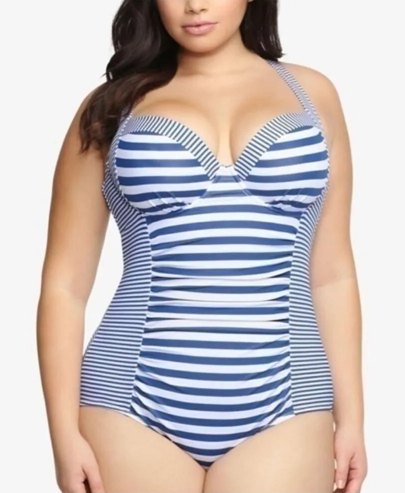 Torrid ruched, pin up girl, blue and white, nautical, striped, full figure, one piece swimsuit. Gorg... Show more