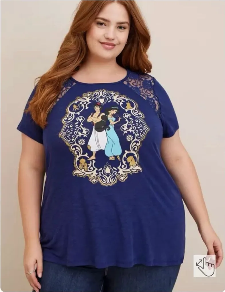 Torrid Disney's Aladdin Princess Jasmine short-sleeve t-shirt with lace shoulder details. Navy tee... Show more