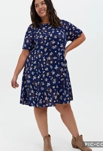 Torrid Blue Leopard Floral Challis Dress ~ With a pretty floral print and lace inset , this dress fe... Show more