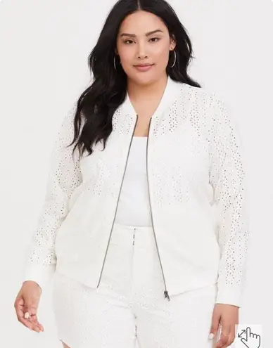 Torrid eyelet, full zip, lightweight, lacy, bomber jacket. Pairs well with a blouse and jeans or sla... Show more