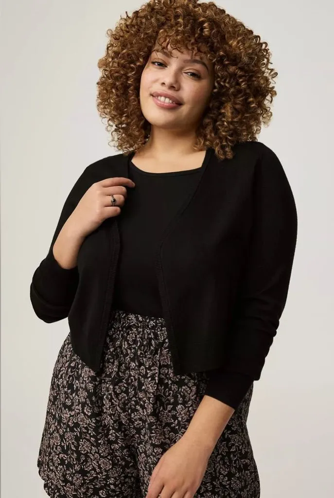 Torrid Fitted Long Sleeve Shrug Sweater size 1 New without tags Solid black Single clasp in fro... Show more