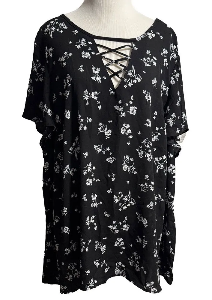 This stylish black and white floral top features a chic lace-up neckline, perfect for any occasion.... Show more