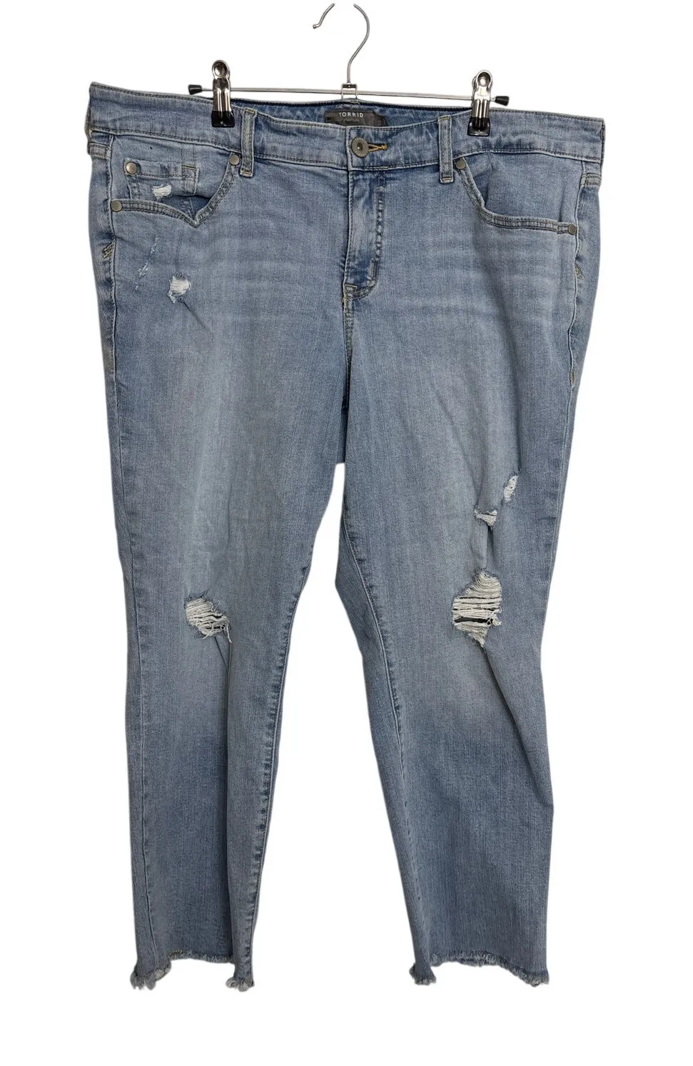 Torrid Crop Boyfriend Straight Jean in Liquid Blues with distressed detailing and raw hem. Part of T... Show more