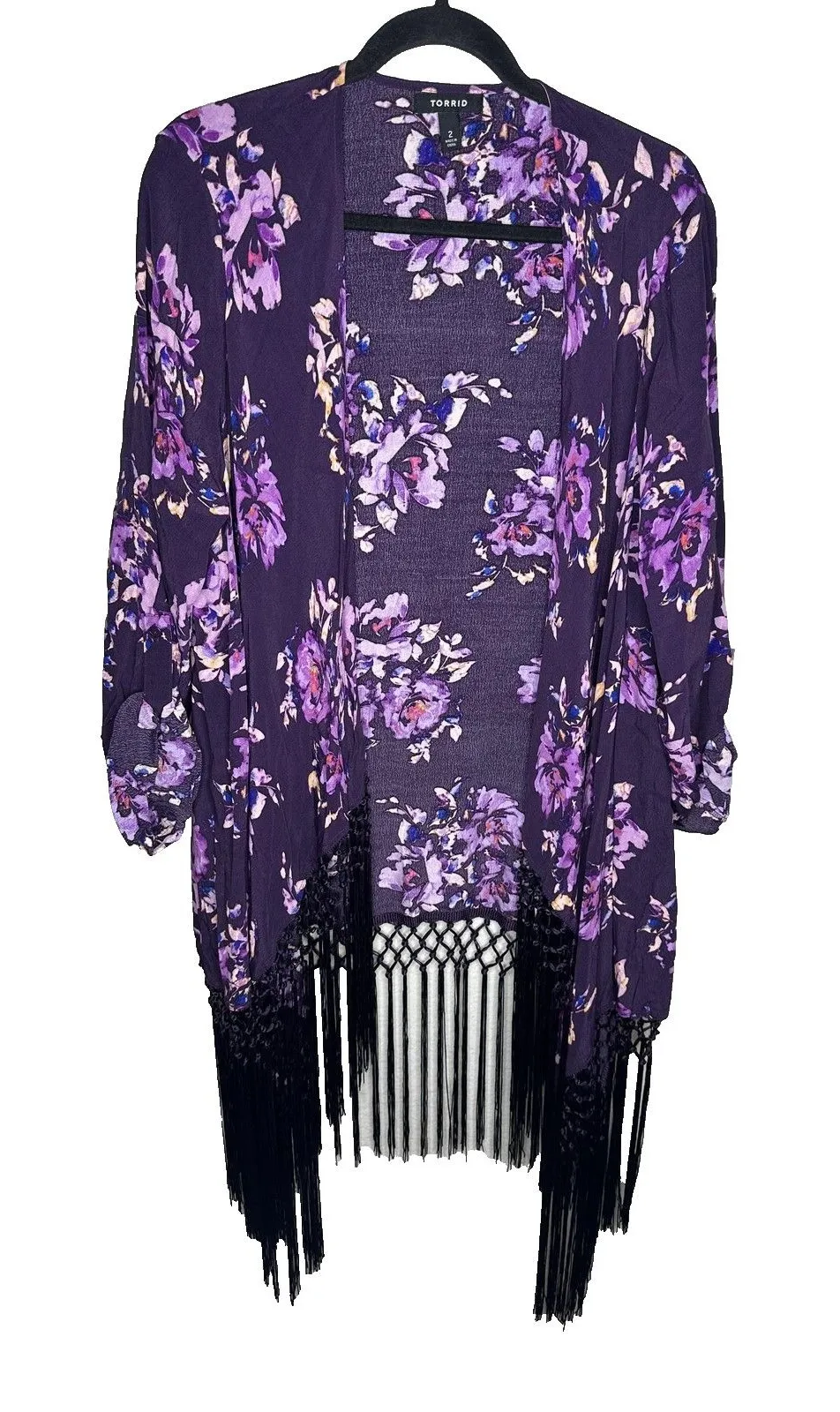 Brand: Torrid Style: Womens open front kimono-style cardigan / duster with a relaxed, flowy fit. Color/Pattern: Deep purple base with an allover purple floral print. Size on tag: 2 (Torrid plus size, approximately 2X). Material: 100% rayon; exclusive of decoration (per tag). Details: 3/4 length sleeves with elastic cuffs, long macrame-style black fringe hem, lightweight woven fabric, boho-inspired design ideal for layering. Manufacturing info: Made in China; RN# 148862. Pit to pit 25" Length 31" Arm Inseam 19" Arm Opening 7"