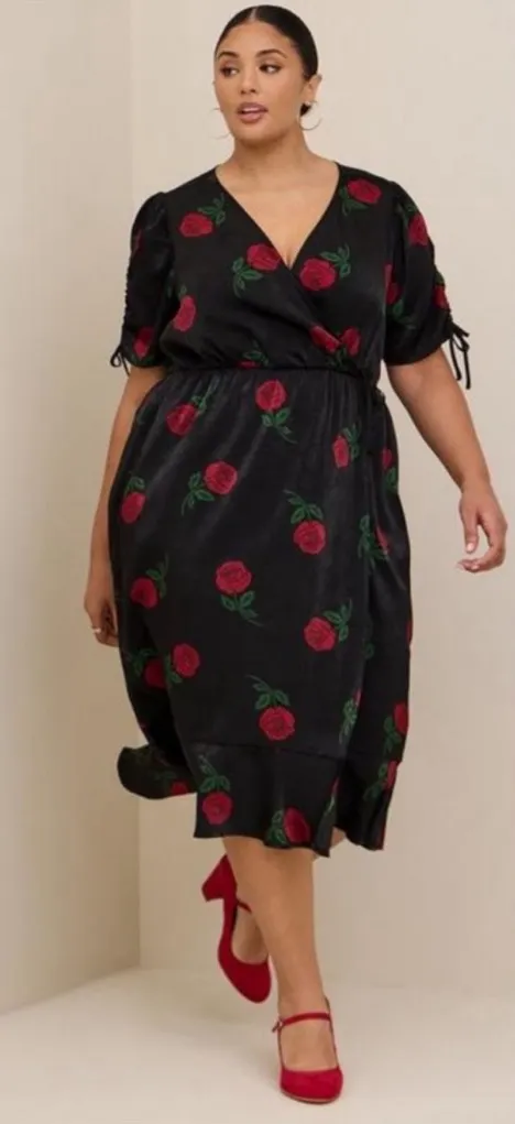 Size 4X Silky like material Red rose floral printed on a black gray background Short sleeves with a... Show more